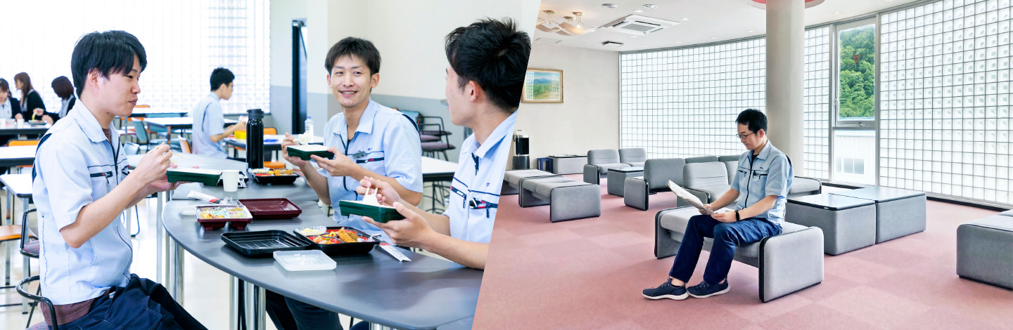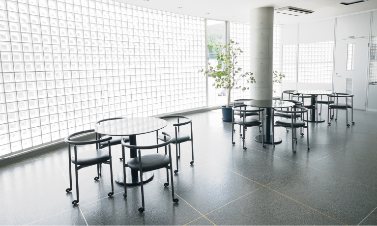 やわらかな日差しが心地よいロビー、観葉植物に彩られた玄関、広々としたエントランス、グレー基調の応接スペースなど、お客様を気持ちよくお迎えするための設計、デザインが満載。